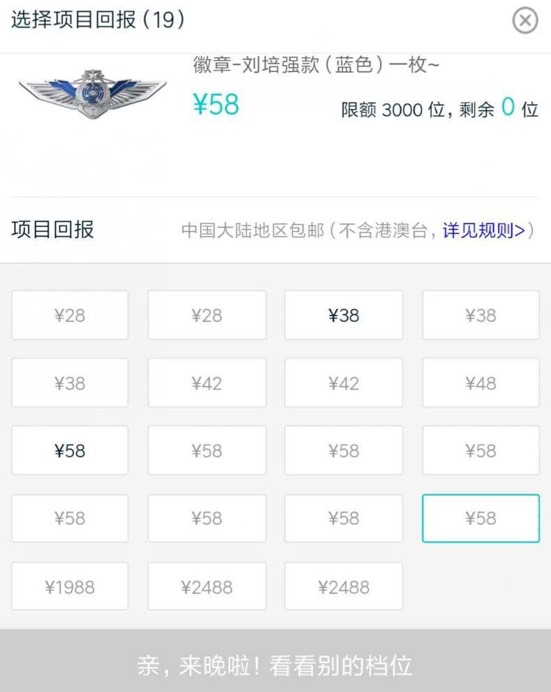 但在众筹开启后,他们的担心从“卖不卖得动”转变为了“货还够不够”。公开资料显示,《流浪地球》电影周边众筹3天以来,众筹总额突破778万,运载车和发动机模型快速售罄,58元的刘培强勋章补档3次也难抵粉丝热情被快速抢空(总量16000)。