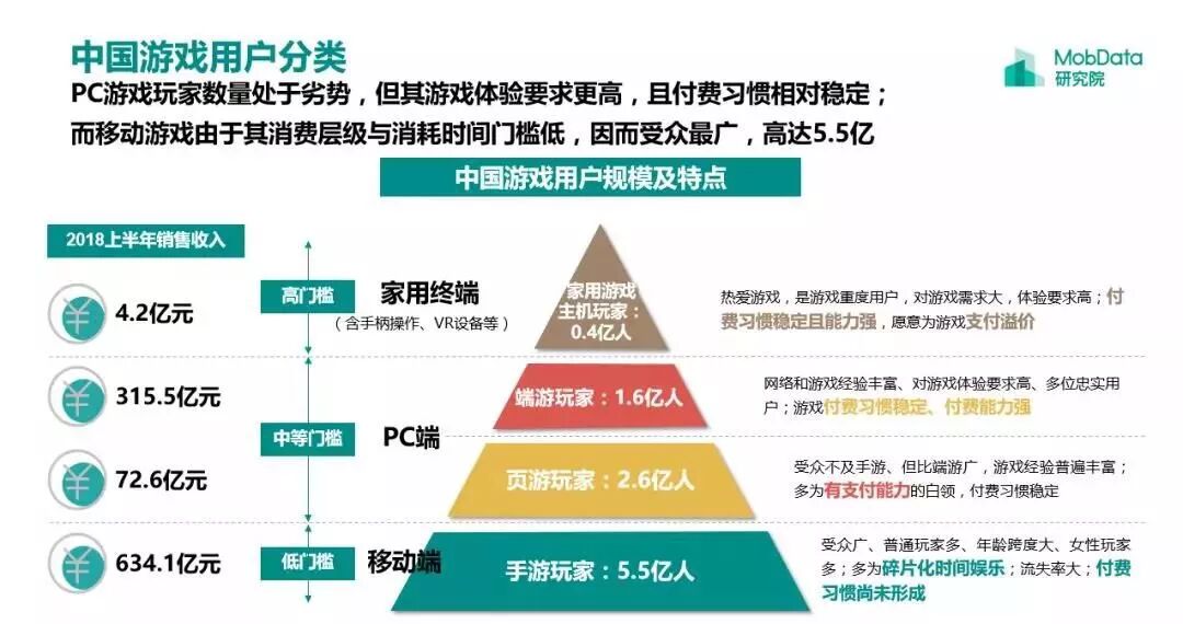 根据MobData发布的《2018年中国游戏行业研究报告》显示:在2018年,PC游戏玩家数量处于劣势,数量上有4.2亿人;而移动端玩家更多,达到了5.5亿人。相对于移动端玩家而言,PC端玩家游戏体验要求更高,且付费习惯相对稳定;而付费习惯仍需培养,可以说在国内,PC端游戏仍然是一个很大的市场。