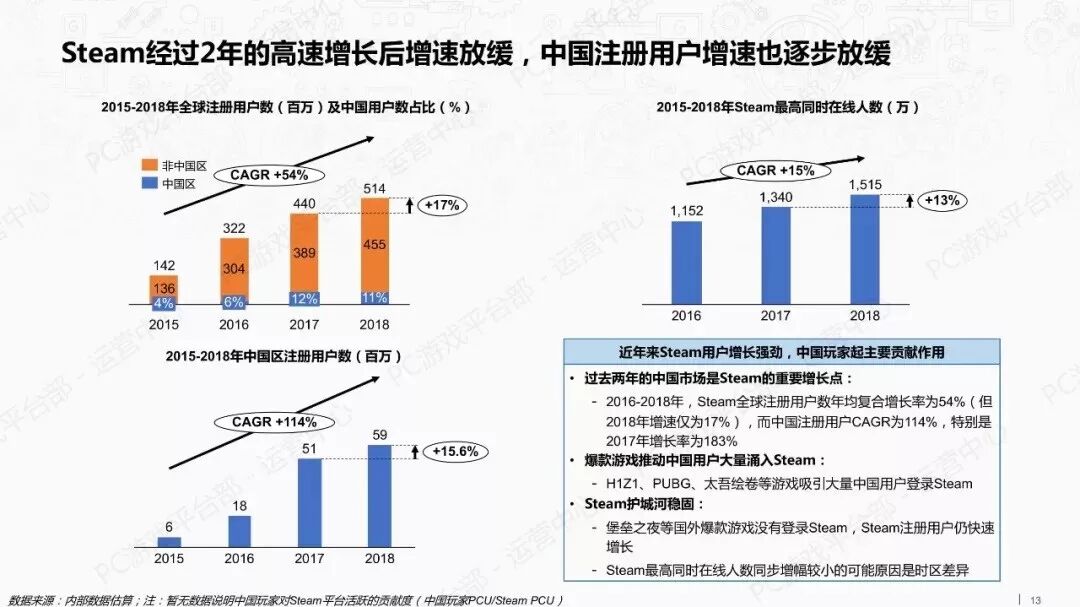 同时,steam在中国的快速扩张也印证了中国玩家对于PC端单机游戏的需求。根据腾讯PC游戏平台部运营中心发布了《2018年游戏行业外部市场观察报告》显示: 2018年Steam全球注册用户数达到5.14亿,其中中国区注册用户达到5900万,占总比例的11%。而2016年~2018年间,Steam全球注册用户数年均复合增长率为54%,而中国注册用户年均复合增长率为114%,两倍于全球。
