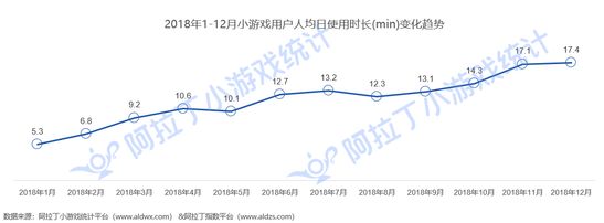 同时在不到一年的时间里,小游戏在2018年迎来了爆发式的增长,截至2018年12月31日,数量增至7000+。而在4月分小游戏正式开放时,这个数字仅仅是个位数。同时,从2018年小游戏用户的人均每天使用时长来看,从1月平均每天的5.29分钟到12月的17.36分钟,上升了228%,用户每天花在小游戏上的时间越来越长。