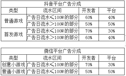 此外,抖音还从广告、内购两方面给予商业化支持。相比微信平台对于普通小游戏的广告分成,抖音平台给开发者的分成比例略高一些。