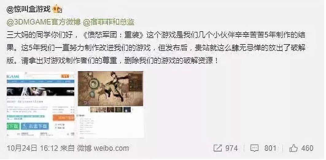 比如,在2017年10月24日,国产STG游戏《愤怒军团》的开发商惊叫盒游戏发布了一条微博,该微博控诉3DM发布了《愤怒军团》的破解版,并要求3DM下架并删除盗版资源。