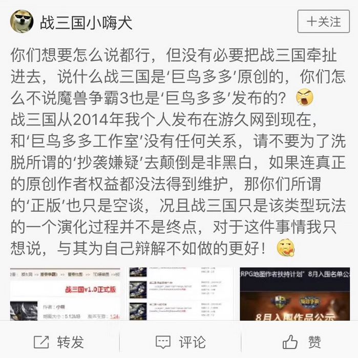 退一万步讲,《刀塔自走棋》本身也不能算是开创者,只能算是把这个玩法发扬光大而已,即便要维权,也轮不到巨鸟多多。在《魔兽争霸3》中,2014年“战三国小嗨犬”就开发出了《战三国》,其中玩法和《刀塔自走棋》别无二致,只不过是《魔兽争霸3》用户少而《DOTA2》用户现在更多而已。