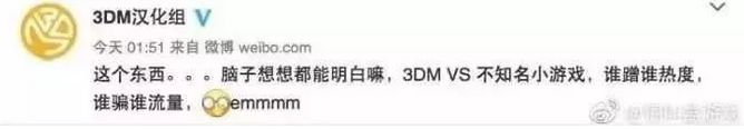 该评论使该事件迅速发酵,不仅知名大V宿菲菲参与了针对这个评论的互怼,更惊动了一个拥有蓝V认证的3DM汉化组在微博上参与了这场论斗。这个微博号发布的一条微博尤其引人注目: