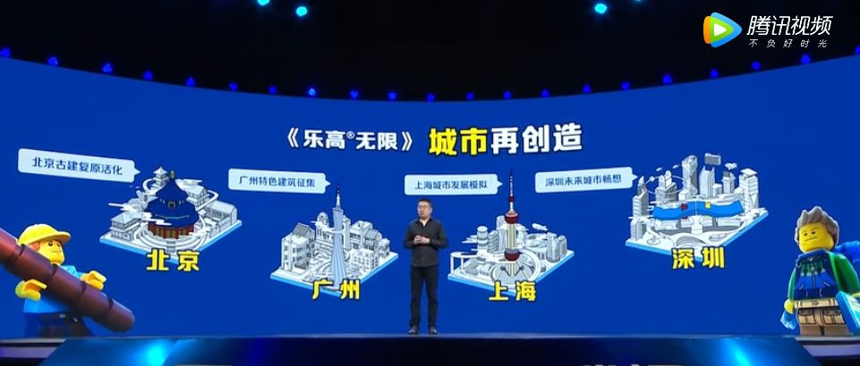 会上,腾讯公布了“乐高无限城市再造计划”,将联合城市合作结构跨界北山广深的四大场景,在游戏内重现城市场景。