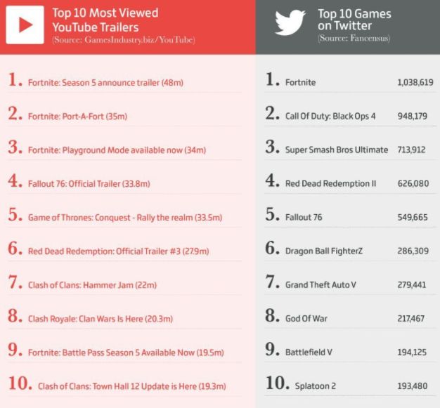报告中还显示,“大屏”游戏占据了Youtube视频播放量榜单的大部分,Twitter热门游戏榜单则无手游进入。