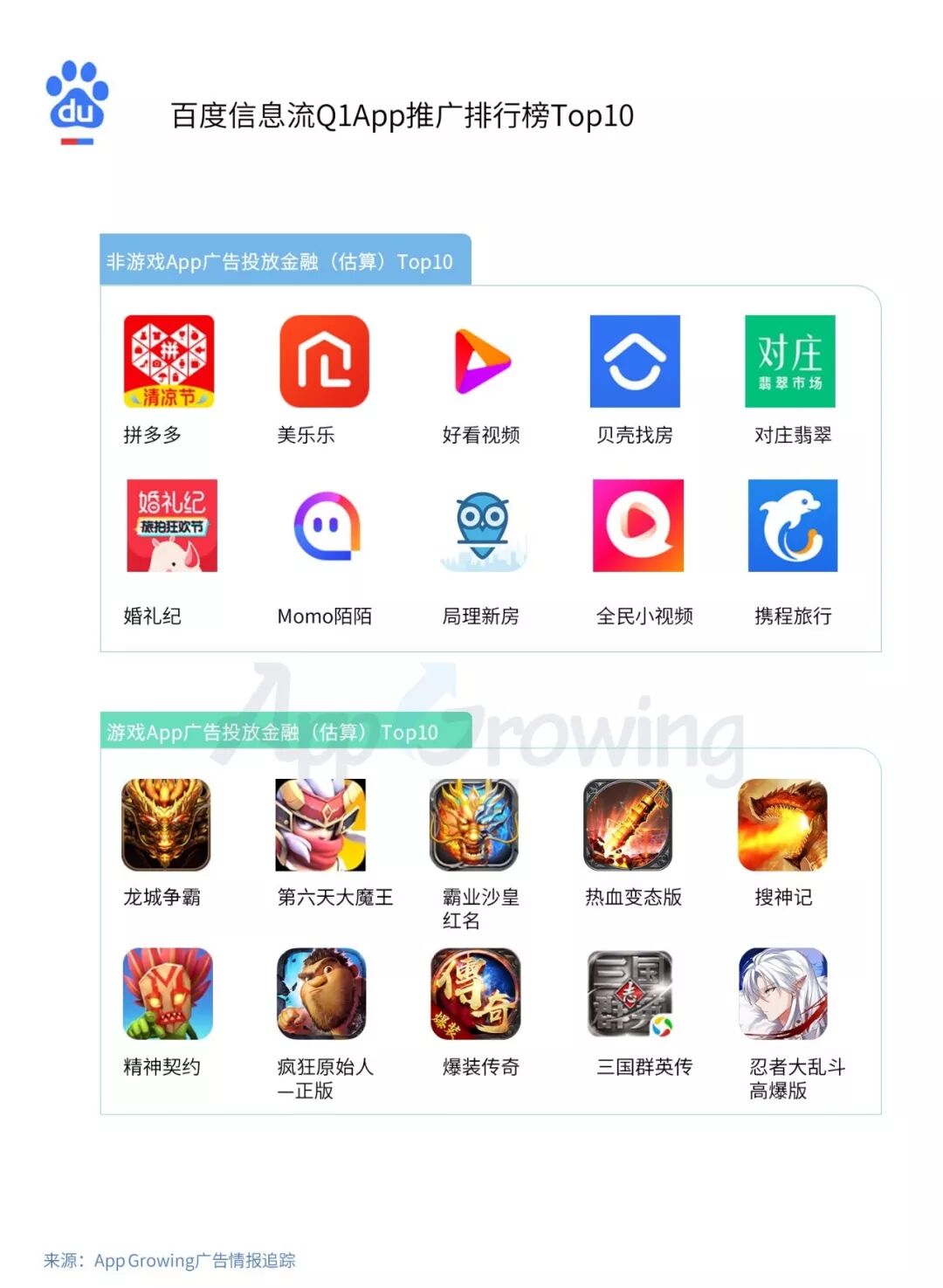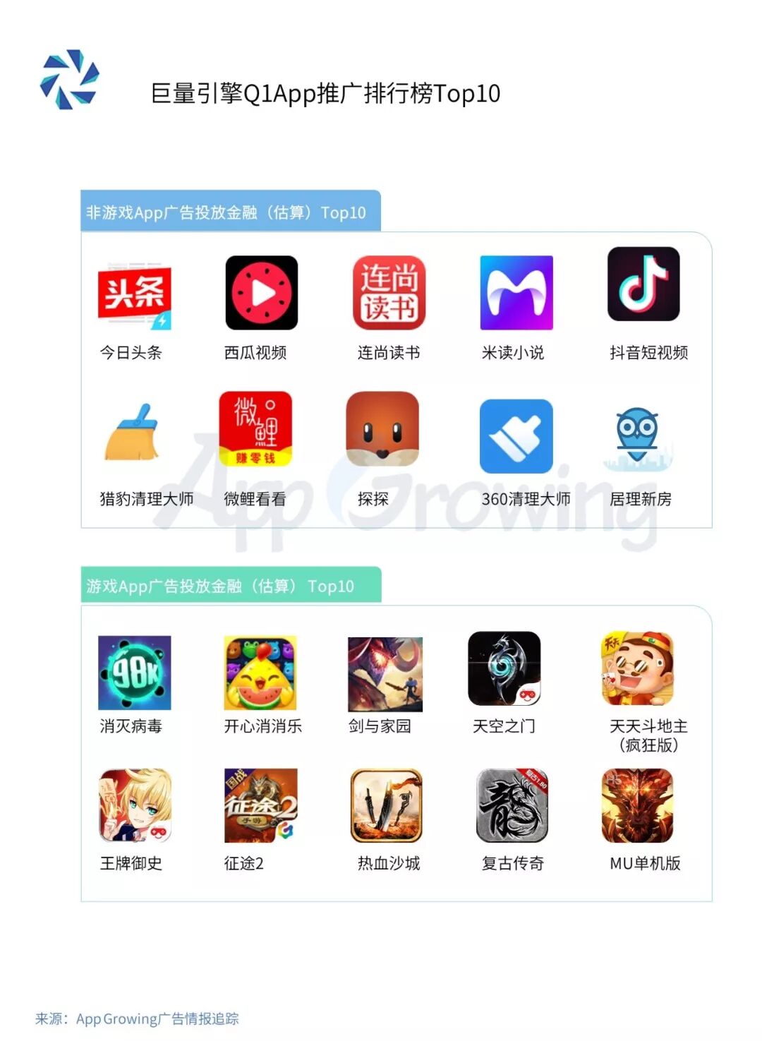 基于 App Growing 的广告算法对所追踪到的单个App的广告投放金额进行估算,整理出该平台Q1广告投放金额排行Top10的游戏及非游戏App,以下同。