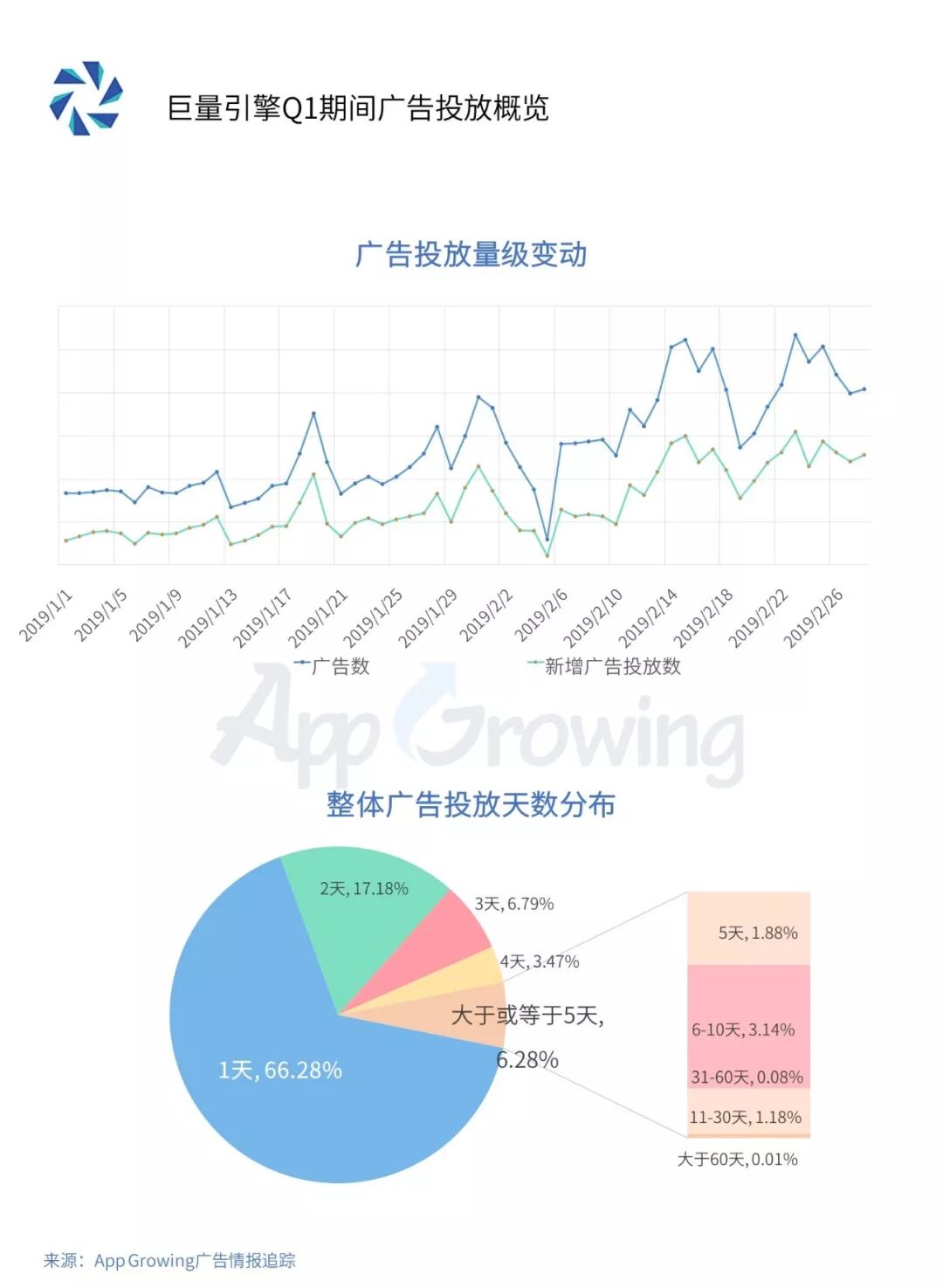 巨量引擎春节期间的广告投放数有下降趋势,节后逐渐恢复,广告投放量级呈现小高峰。广告素材的更新同样较为频繁,Q1累计投放天数超过4天的仅6.28%。