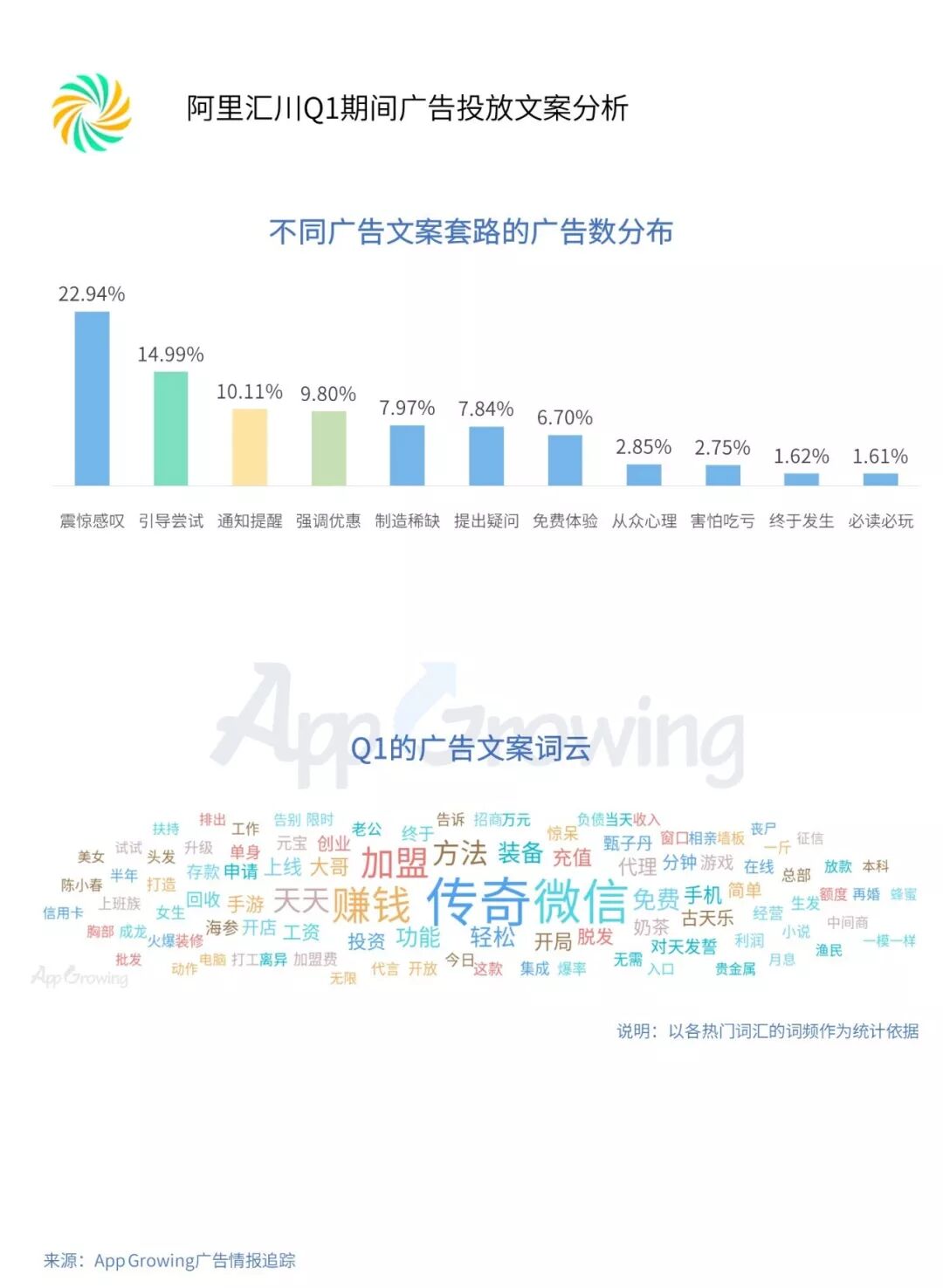引导尝试类与震惊感叹均为其重点使用文案套路,“免费”及“手机”为该平台广告文案的高频词汇。