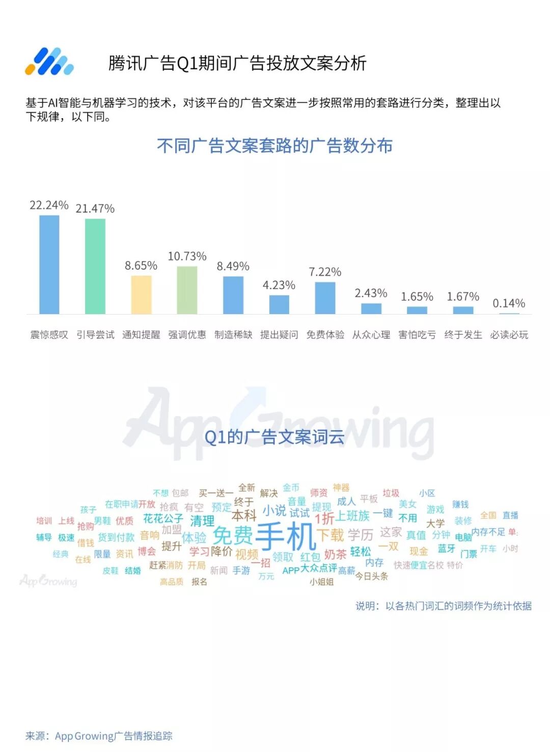 震惊感叹、引导尝试、通知提醒为其常见的广告文案套路,使用了震惊感叹套路的广告文案占比22.24%。而“免费”、“下载”,“手机”则为腾讯广告平台较为高频的词汇。