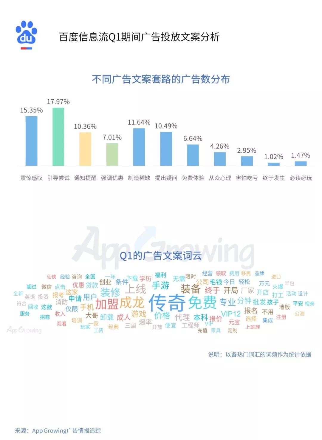 传奇类游戏在百度信息流广告平台投放较为强势,“传奇”为其广告文案的高频词汇,而“免费”这个词也使用较为频繁。