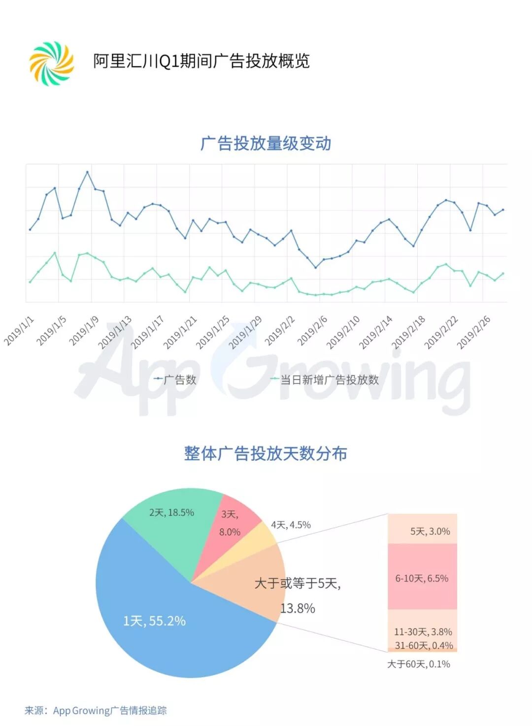 由图可以看出,1月7日-1月10日阿里汇川的广告投放量级呈现小高峰,Q1期间投放天数为1天的广告占比55.20%,有87.2%的广告投放天数不超过4天。
