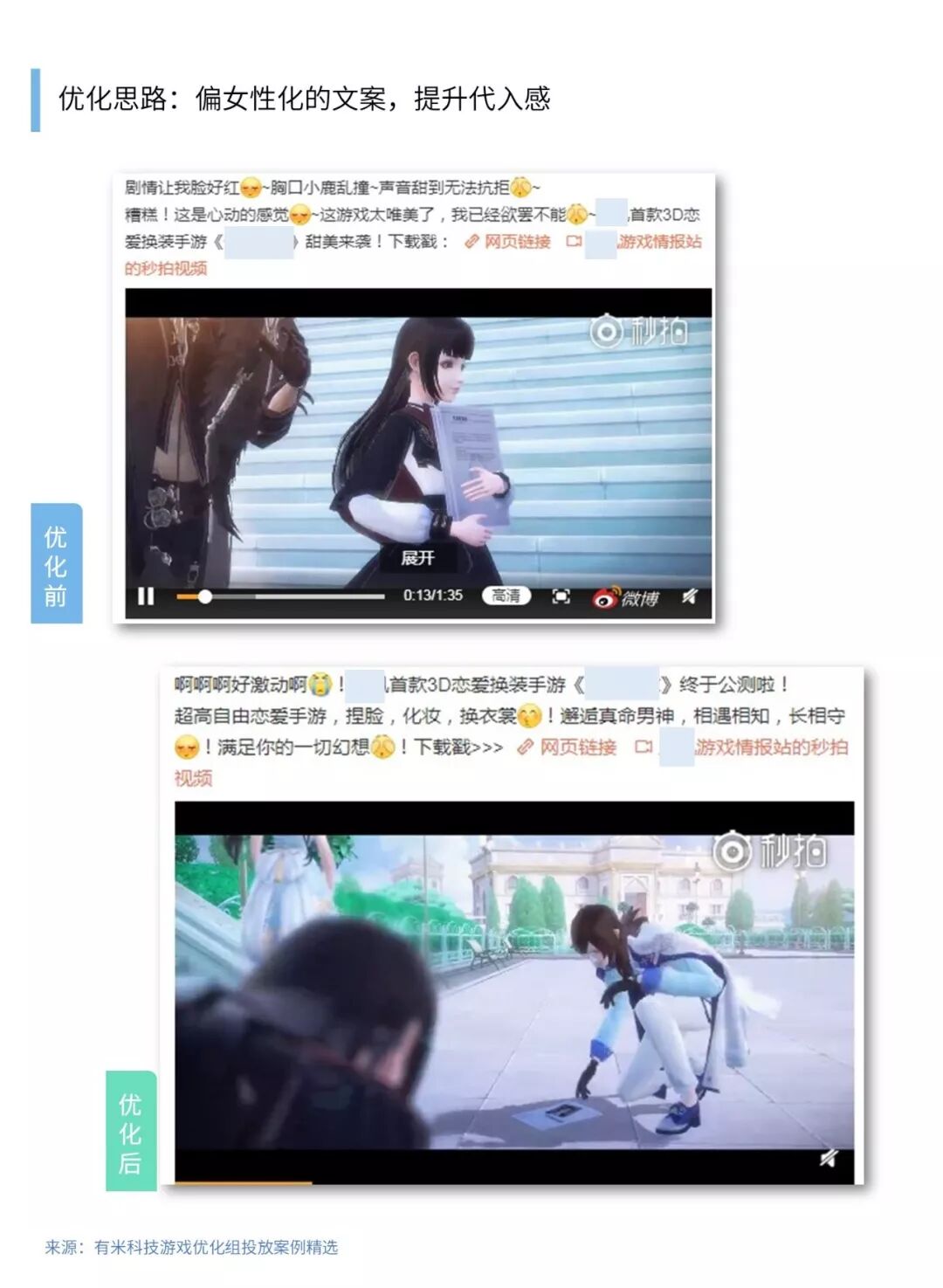 素材3:通过对剧情进行一定剪辑,将两人之间的故事线剪辑得更加密集,偏女生语气的文案,加深了用户对游戏的代入感,成功提升了互动,降低了成本。