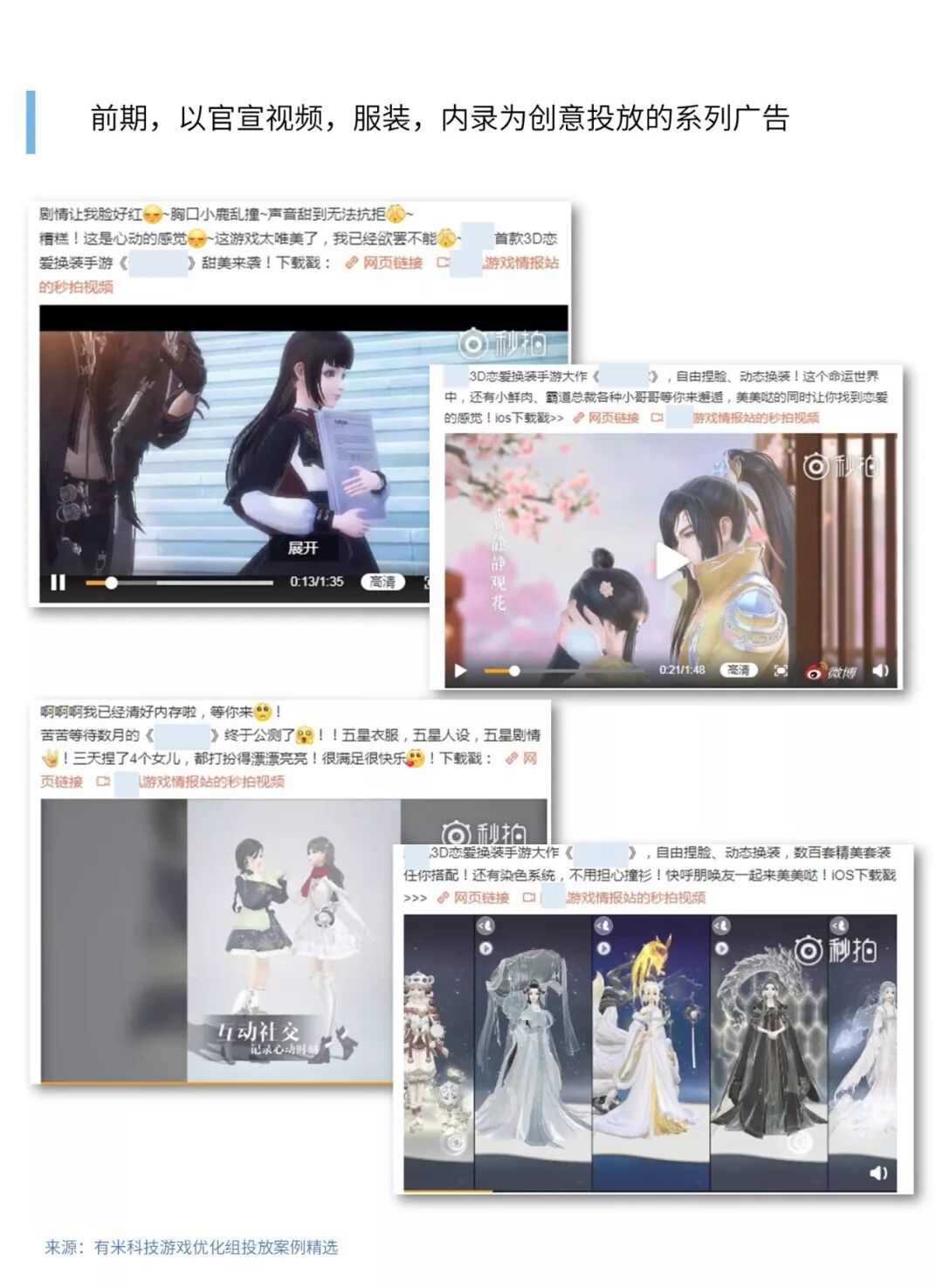 投放以直观的素材玩法展示,各大角色CV,换装多样性玩法展示,剧情走向等素材,CG素材为主。人群方向则主要包括游戏动漫,恋与制作人暖暖等竞品类游戏用户。投放结果勉强达标,CG视频的效果比较好,CV类的游戏素材互动率明显较高,转化较好,而剧情向的视频效果较差,没有达到预期的效果,但是总体的测试方向是可行的,于是在此基础上进一步优化素材及文案。