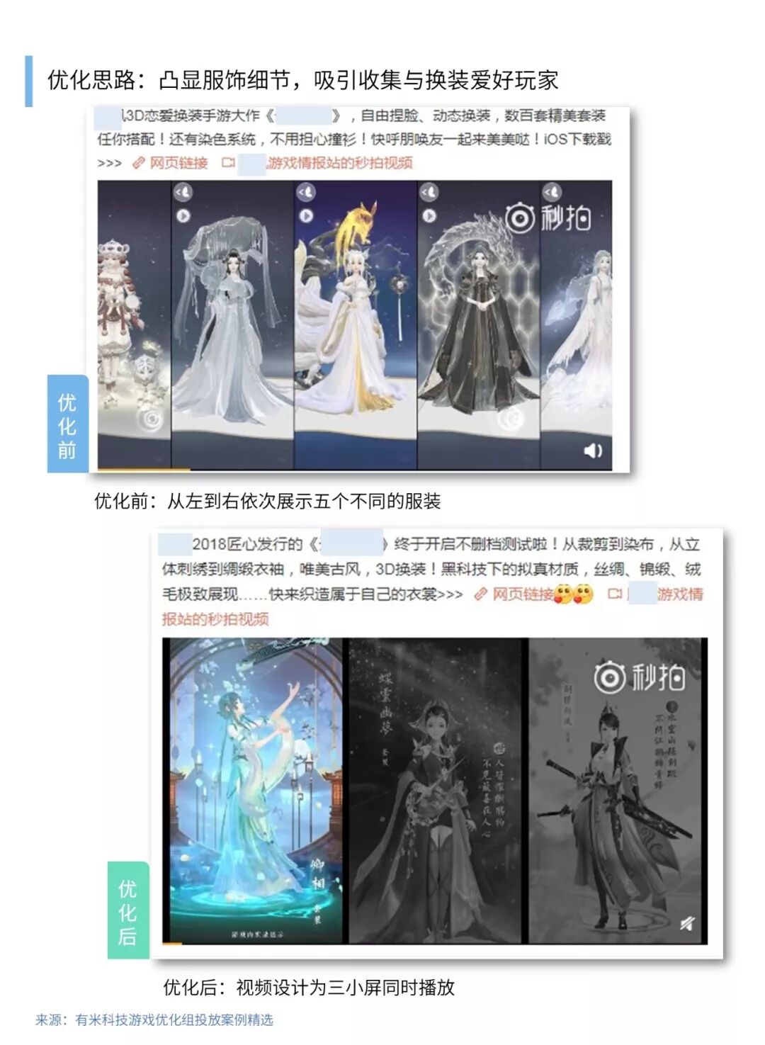 素材2对服装视频素材进行了创新修改。原本是直接一次性从左到右依次展示,用户容易有一种眼花缭乱的错觉,通过调整后,改为三屏同时出现,每一屏展示不同的服装,让用户可以细心看清楚每一种服饰,吸引部分有收集爱好以及换装爱好的用户。调整后,互动率提升了3%,成本下降,量级提升。