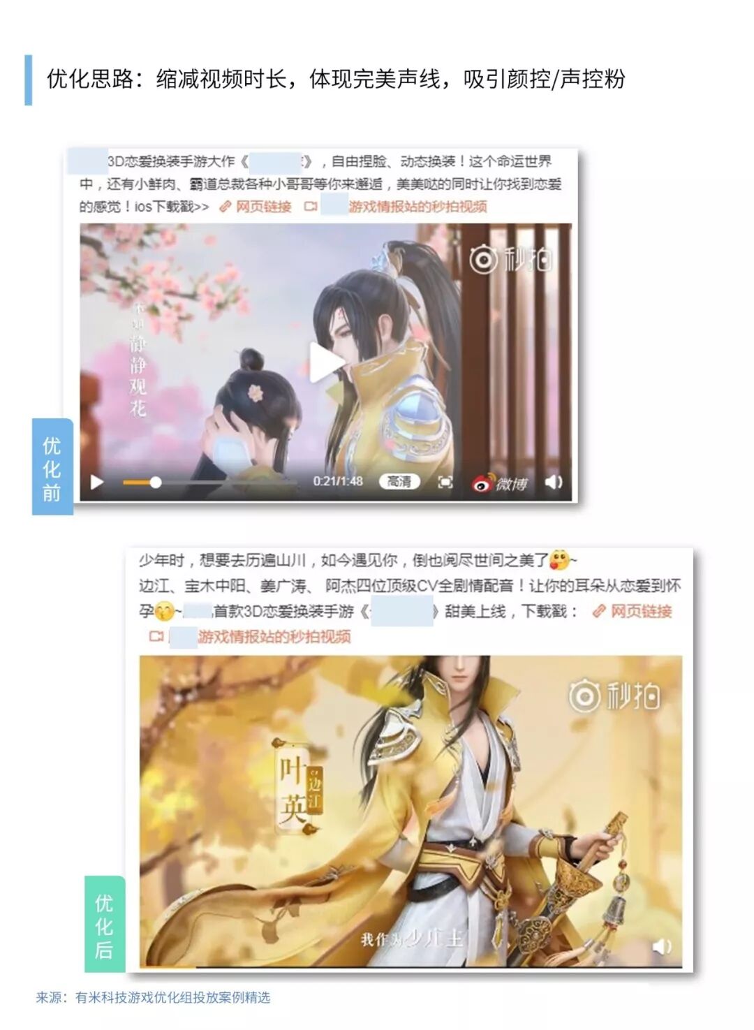 素材1对视频时长进行了一定的缩减,着重体现几个人物特色以及完美声线,同时在文安中用视频中的情话对应,提到相应的声优,吸引众多的声控颜控女性用户,互动率提升了2%,成本下降了一半,量级显著提升。
