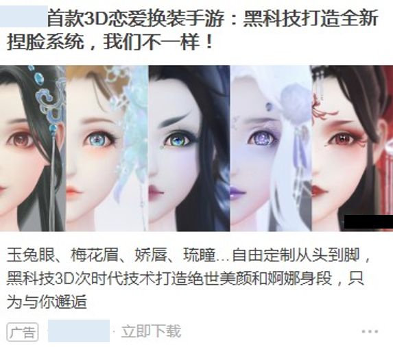 ① 妆容搭配,文案用免费尝试不同妆容来引导用户,素材展示不同的妆容,偏向日常并且大多女性用户都想尝试的妆容,增加用户对游戏的好奇。