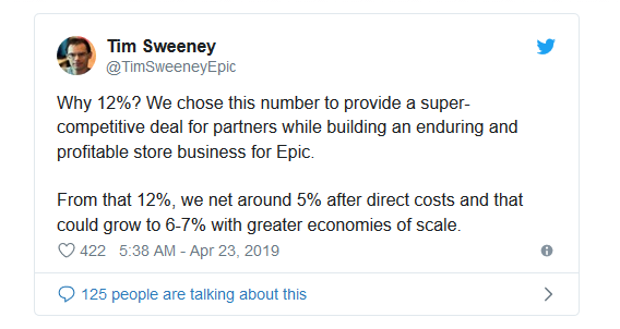 在推特上总裁Sweeney表示:将平台抽成设定为12%其实可以为我们的合作厂商提供竞争优势,同时还能为Epic和游戏产商之间建立互利共赢的关系打下坚实基础。而在12%的平台抽成中,除去成本,我们获利大约为5%。而随着规模的扩大,利润率可以达到6%—7%。