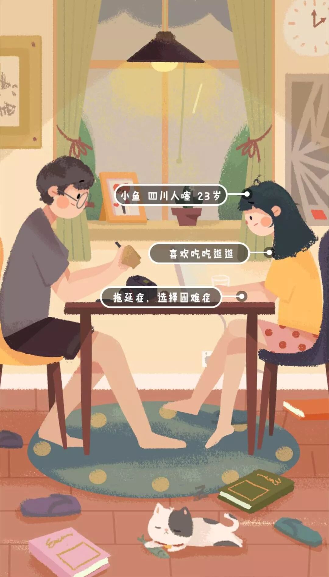 《旅行串串》的故事主角是一对在北京工作生活的小情侣,男生叫老孟,25岁,是个北京爷们儿,职业是个摄影师,喜欢运动和做饭;女生叫小鱼,正宗的四川人,23岁,比老孟小两岁,喜欢吃吃逛逛,缺点是拖延和选择困难。同时,他们还有一个猫主子,叫桃子,很可爱的一只小喵咪。