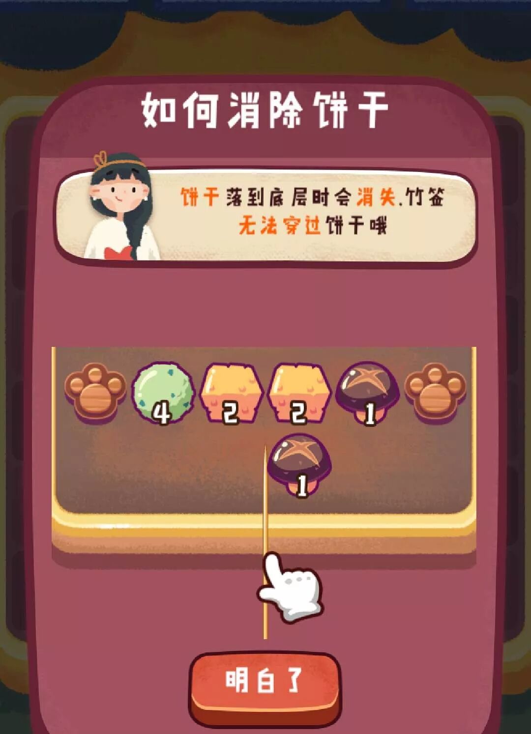 但如果整个游戏流程都是重复这样的消除方式的话,游戏会变得非常枯燥乏味。因此,游戏在后期,加入了各种各样的玩法和通过要求,引入了“海苔,软糖,饼干……”各种各样需要玩家通过各种方式才能收集,或者避开的挑战。同时,也引入了多种多样的竹签技能丰富了玩家可以选择的手段,使得游戏变得有趣又好玩。
