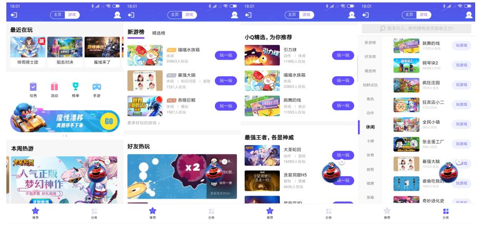 热游位置下方是新游榜和精选榜,接下来就是好友热玩等一些次级展示位置。值得一提的是,这些推荐位是分类展示的,除了开始的“好友热玩”“限时推荐”之后,位置被分成了“消除”“脑力”等细分分类。