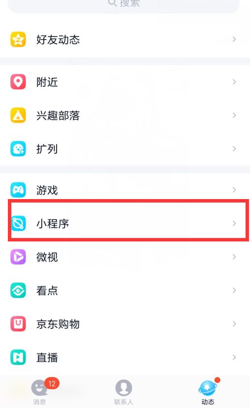 在手机QQ动态中选择小程序,也可以直接进入QQ小程序中心。