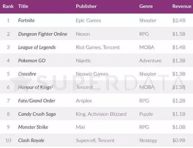 市场调研机构Superdata在今年年初公布的数据显示,在2018年最赚钱免费游戏榜单上,《英雄联盟》(14亿美元)仅次于《堡垒之夜》(24亿美元)和《地下城与勇士》(15亿美元)。