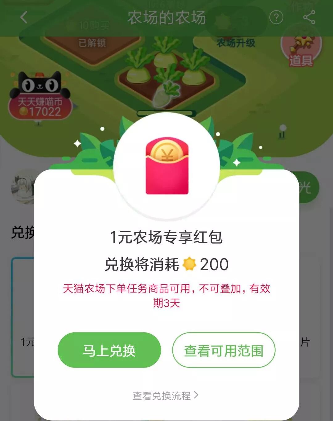 天猫农场则是类似于当年火遍大街南北的偷菜游戏,但是引入了“阳光”这个货币概念。玩家可以通过种蔬菜,养动物,去好好友家偷来收获阳光,阳光的数量也和农场的等级挂钩。当然,最重要的,在天猫生态当中,阳光可以作为一种虚拟货币来兑换现实商品。根据天猫农场的兑换攻略称,玩家只需要付出相应的阳光,不仅可以兑换到购物红包,还可以用一分钱的代价买到自己心仪的商品。