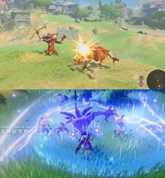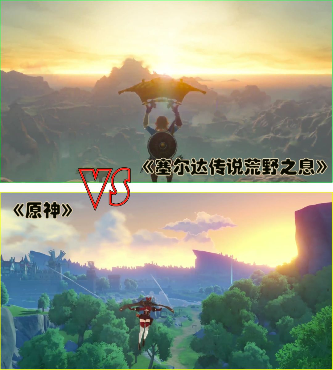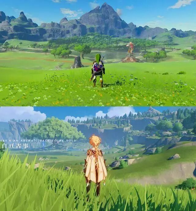 其中较为明显的就是《原神》场景中的草地,以及人物独特的渲染风格,从高处滑翔的场景都给了玩过《塞尔达:荒野之息》的玩家一种非常强烈的既视感。