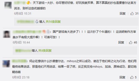 在《原神》的官方新浪微博中,有玩家认为,天下游戏一般抄,如果抄袭得好他们也一样买单。甚至有玩家表示:抄袭也是一大进步,证明米哈游的审美提高了。我国自古就有一句话“毋剿说,毋雷同。”这句话是什么意思呢?意思是告诉我们不要去剽窃也不要去弄虚作假。多年的教育也告诉我们剽窃也好抄袭也罢这些都是不对的,而如今,面对此次《原神》“疑似抄袭”事件,玩家们竟然认为“抄袭”也是可以的。作为国内游戏大厂的米哈游,竟用如此宣传手段引导玩家想法,这样真的合适吗?