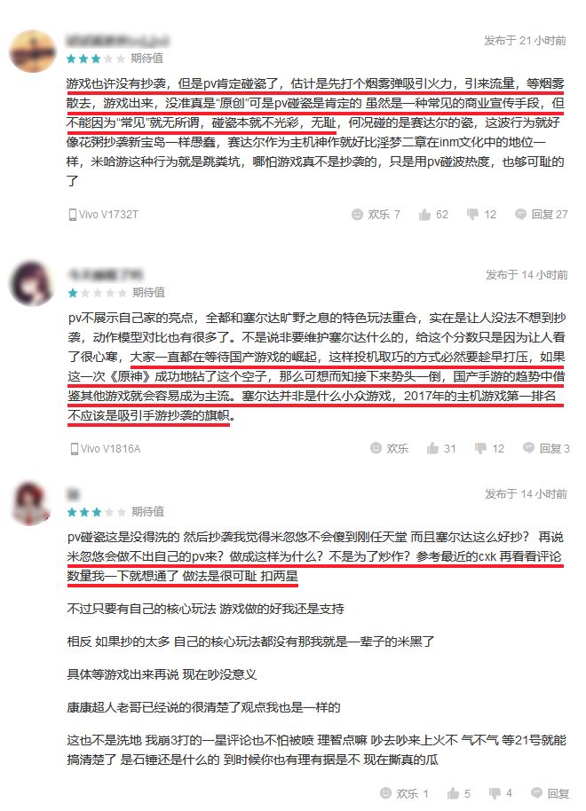在《原神》PV视频发布后,TAPTAP平台上不少玩家给这款游戏的期待值评分是1-3星,为什么不是5星呢?他们表示:《原神》游戏宣传视频“碰瓷”《塞尔达传说荒野之息》这件事,米哈游游戏方应该在视频制作之初就知道了,但他们仍然将这部视频发布出来,可见这是宣传有意为之。这种别有用心的蹭《塞尔达传说荒野之息》热度的商业宣传行为很可耻,实在不是一个国内游戏大厂应该有的作为。