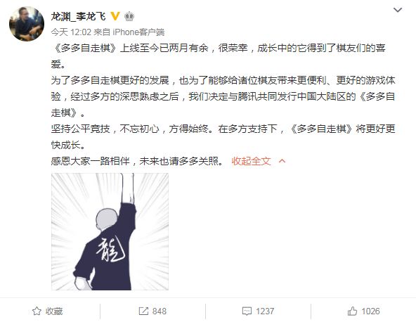 7月2日中午12点刚过,龙渊网络CEO李龙飞发送的一条微博在相关圈子引发了地震“”。李龙飞在微博中表示,《多多自走棋》上线两个月有余,在成长的同时也获得了很多棋友的喜爱。为了给棋友们带来更便利、更好的游戏体验,他们决定于腾讯共同发行中国大陆地区的《多多自走棋》。