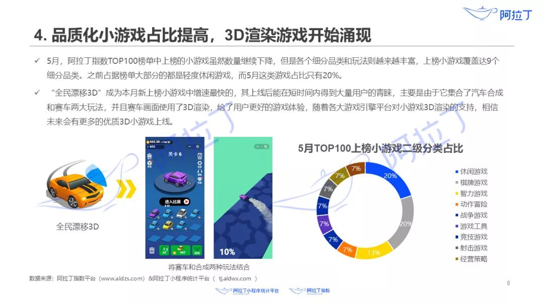值得注意的是,在阿拉丁数据同一时间公布的《2019年5月微信小程序TOP100榜单解析数据研究报告》中,阿拉丁将《全民漂移3D》单独用一页的篇幅来描述。报告认为,全民漂移在上线后短时间内受到大量用户的青睐,主要它集合了汽车合成玩法和赛车两大玩法,并且赛车画面使用了3D渲染。并且报告认为《全民漂移3D》的出现代表了品质化小游戏的占比提高。
