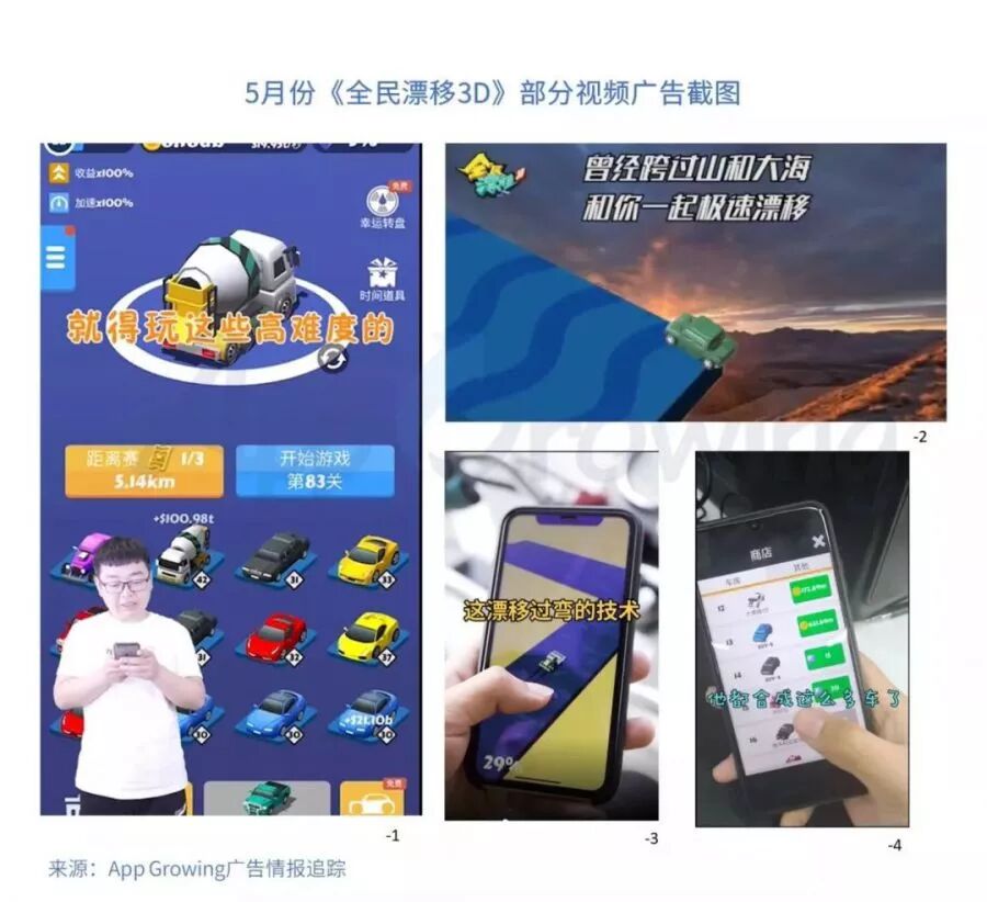 在今年6月份,App Growing发布了《2019年5月份手游买量市场分析》,其中的数据显示,在仙侠,战争,传奇题材游戏占据的买量市场,《全民漂移3D》强势抢量,为2019年以来首款位列月广告投放金额(估算)手游推广排行榜Top20的竞速类手游。多建广告广铺量为其主要的投放策略,App Growing的数据显示,该游戏5月份投放的广告超过1.2万条,主投懂球帝平台(广告数占比为66.4%)。