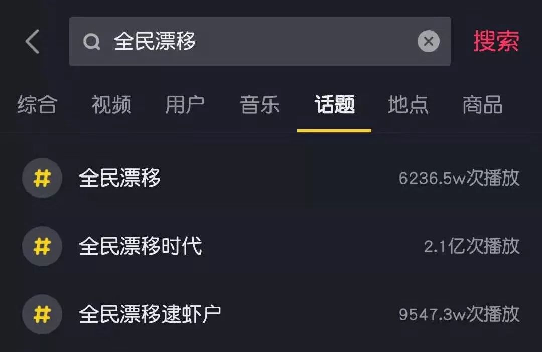 同时,在话题制造地的《抖音》,以“全民漂移”为关键字进行搜索,排在前三位的“全民漂移”“全民漂移时代”“全民漂移逮虾户”三个话题的播放量加起来已近达到了3.7亿次。可以完全称得上是抖音爆款游戏