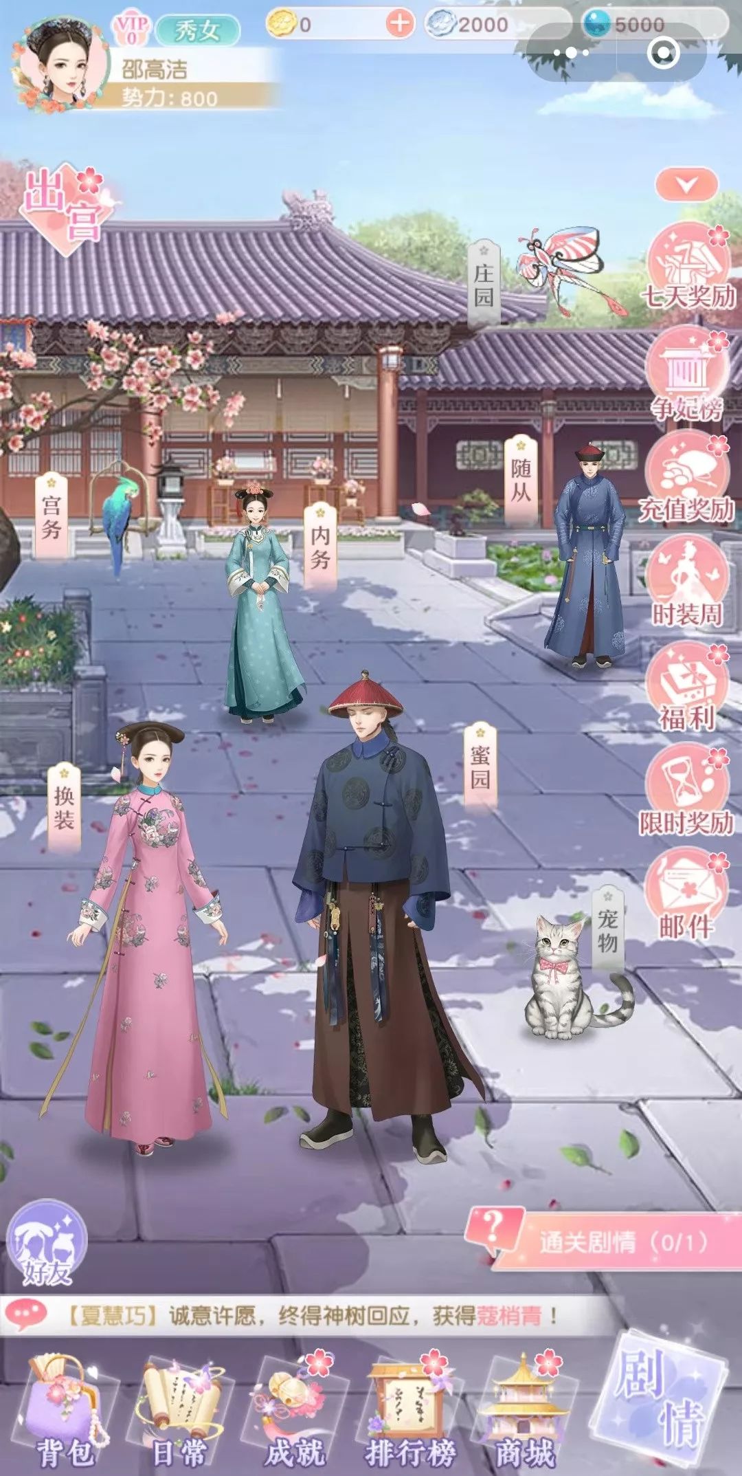 简单的统计下,在游戏的角色提升页面就有着“换装,密园,宠物,随从,内务,公务和庄园”7个大的系统。玩家需要利用这7个大系统,来提升自身的势力值,进而才能正常的进行主线任务。而这7个系统本身又自称一大体系。