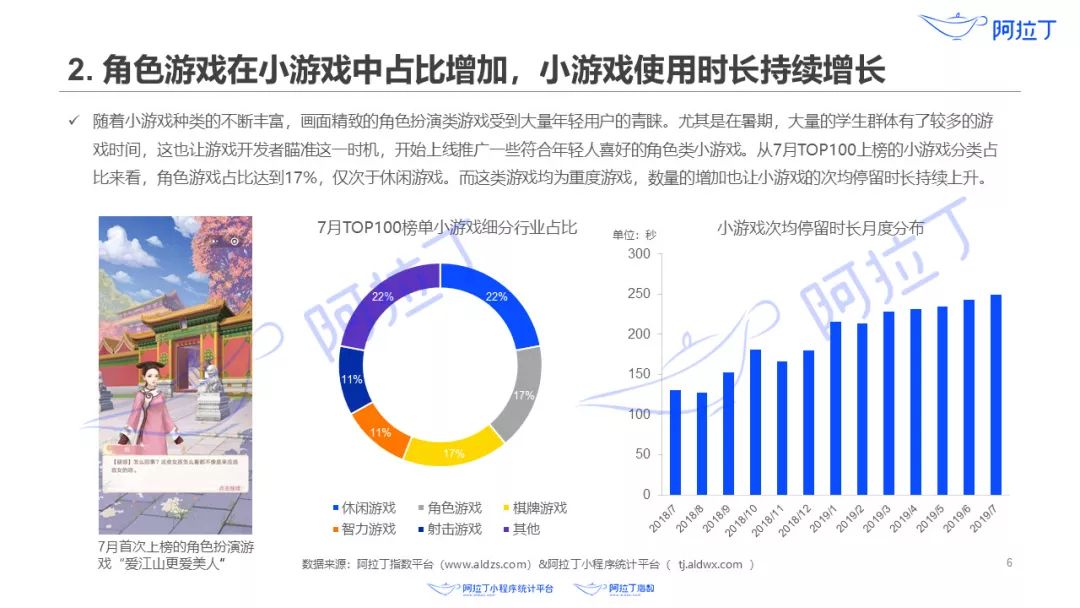7月31日,阿拉丁数据研究院发布了《2019年7月微信小程序研究报告》,在报告中,阿拉丁发现了角色游戏在小游戏中占比增加,小游戏使用时长持续增长这样一个事实。并提到了首次上榜的角色扮演类小游戏《爱江山更爱美人》。
