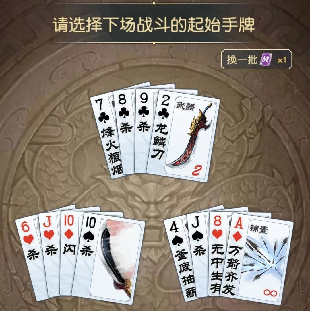 在游戏的开始之前,玩家可以根据自己英雄的特性,或者当下战场的一些状况,在游戏提供的三个不同起手卡组中选择最合适的一套进行使用。爬塔之初,玩家遇到的敌人相对而言比较简单,数量只有一个,血量一般只有一点到两点,玩家可以轻松战胜。而在爬塔中后期,玩家遇到的敌人就会越来越难,数量也变成了两个,经常出现一些很恶心的搭配出现,比如在后期有的敌人会有“红牌当杀,无限出杀,杀必命中”的神奇组合,极度考验玩家的运气和对战场局势的掌握。