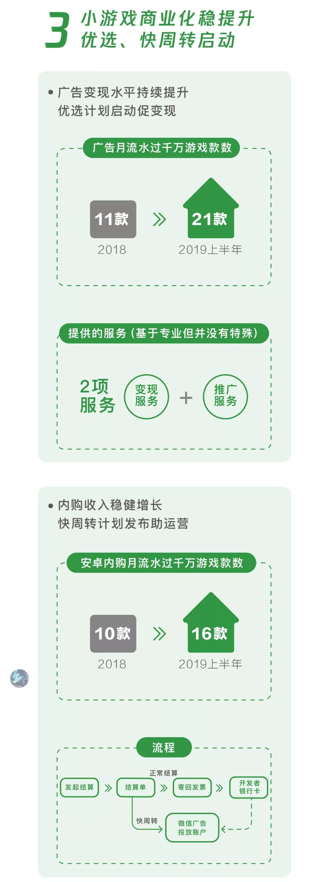 目前,共有21款小游戏广告月流水过千万,16款小游戏内购月流水过千万。微信广告优选计划已提上启动日程,提供推广与变现一体化的合作方案,寻找更有潜力的优质小游戏;快周转计划已在8月上线,小游戏开发者不局限于安卓道具内购、小游戏广告组件内测这两大创收模式实现变现。快周转支持内购收入及时转为广告投放金,道具收入转投广告周期最快从45天下降至17天,将进一步加快小游戏营收的周转能力。