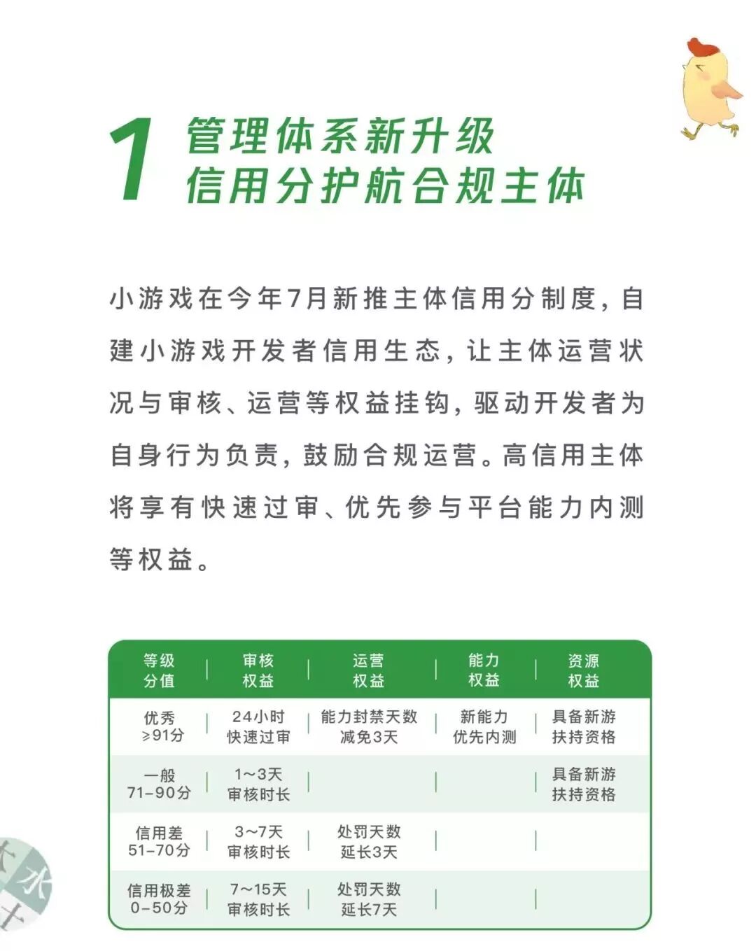 小游戏生态管理模式直接关系到小游戏的未来走向,为了确保生态发展健康,每个开发者合规运营小游戏、不触碰雷区,平台构建信用评价体系,来保护开发者、用户以及平台的权益。