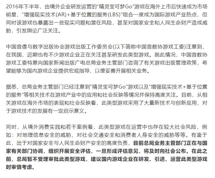 仔细阅读游戏工委的消息,会发现主管部门分了三个方面提及了他们对AR+LBS类游戏的担忧。