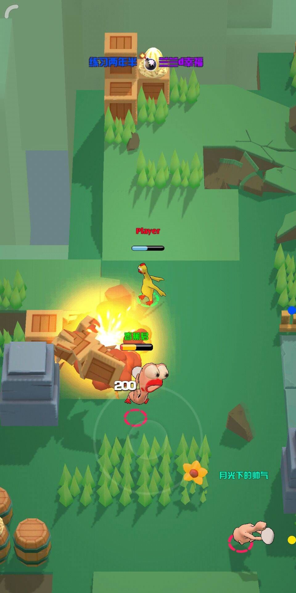 《screaming chicken》的玩法十分简洁明了,玩家将扮演一只“鸡”进入地图中,与其他玩家展开一场“大逃杀”。只不过和战术竞技手游不同的是,《screaming chicken》不需要在地图中寻找各种道具,玩家的角色每隔几秒将会获得一颗蛋,将蛋抛向敌人即可对敌人造成伤害,消灭对手,生存到最后。