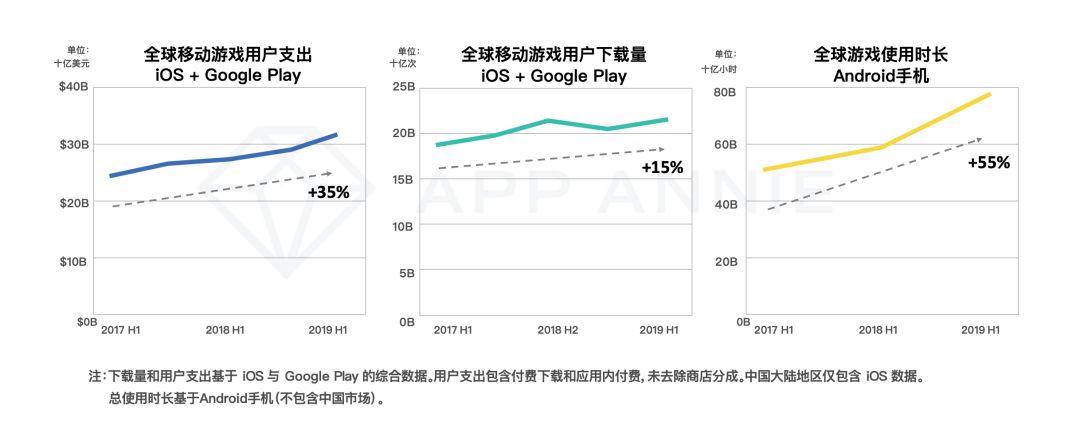 App Annie 今年早些时候发布的《2019 中国移动游戏出海深度洞察报告》中更新了全球手游市场增长的情况。从下面的表格对比中我们可以发现,在过去的两年中,全球游戏下载量增长逐渐趋缓,相反,用户支出和使用时长则继续保持着强劲的增长态势,增速分别高达35%和55%。