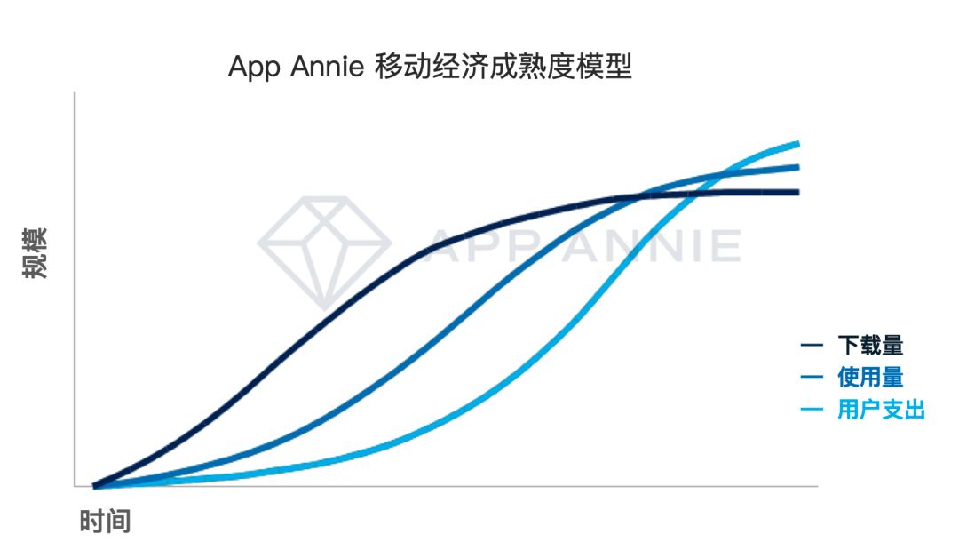 对于一个新兴市场来说,市场的开拓意味着下载量的提升,因此首先是 App 下载量的爆发式增长,用户的涌入随之带来使用时长和用户支出增加,在装机量和核心用户群趋于稳定之后,最后才会带动收入的持续增长。
