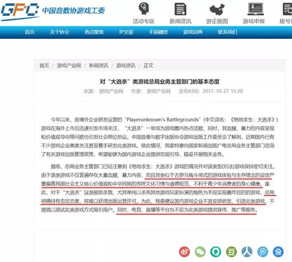 10月27日国内游戏行业官方协会组织游戏工委(中国音像与数字出版协会游戏出版工作委员会)发布消息,称在咨询国家新闻出版广电总局意见后得知,总局对“大逃杀”类游戏持不鼓励态度,并明确表达了“国内游戏企业不宜安排研发、引进此类游戏,不提倡以测试此类游戏方式吸引用户。同时,电竞、直播等平台也不应为此类游戏提供宣传、推广等服务。”的意见。