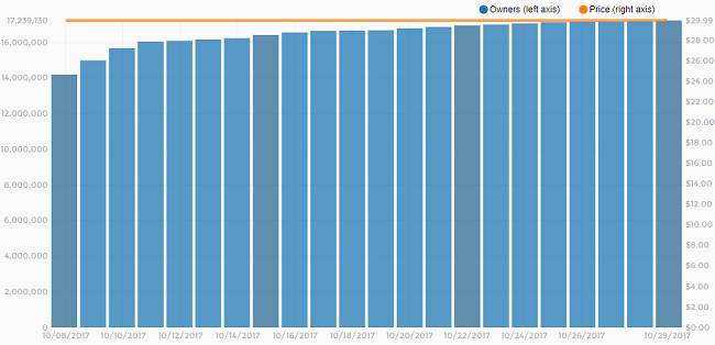 根据Steam Spy的数据,虽然《绝地求生》已经卖出超过1700万份,但明显近半个月销量走势放缓。如10月6日《绝地求生》销量为1353万,短短5天过后,《绝地求生》就又卖出超过250万份、10月11日总销量达到1605万份,平均每天销量超过50万。