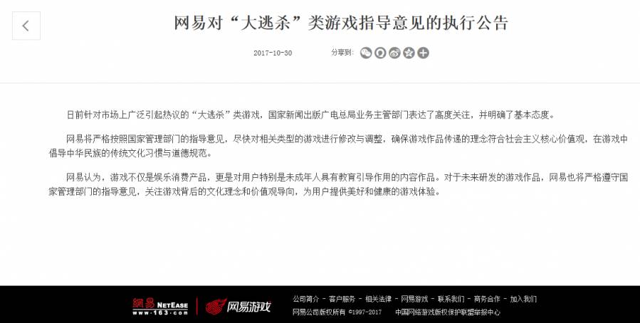 10月30日,网易也发布了对“大逃杀”类游戏指导意见的执行公告。