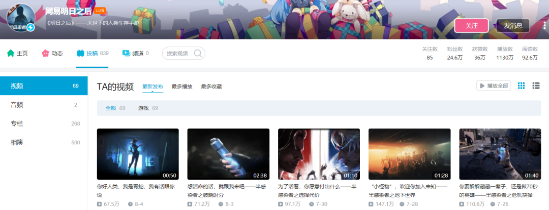 值得一提的是,《明日之后》在新资料片上线后取得了出色成绩,但并不让人感到特别意外。这是因为早在7月初的预热阶段,随着全新概念“半感染者”的公布,就引起了各大网络社区热烈讨论与二次传播。以《明日之后》B站官方号为例,在此期间就有三部宣传片突破100万播放量,另有多部视频突破50万。