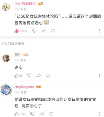“这游的文案给我一种:想努力讨好女玩家但是说出来的话刻板印象、不伦不类。他们很热血,能看得出来。但他们的热血不是去了解女性用户,而是强加给女玩家,我觉得你想要的这个,我觉得你们女的就该怎样怎样。”