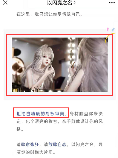 有女玩家认为,和Vvanna强调的“自由”“定制”“尽情做自己”截然相反,在官方文章中附带的人物配图审美方向都趋于一致,并没有表达出多元化的意识形态,反而像在教育玩家“什么才是美的”。那句“拒绝白幼瘦的刻板审美”与这句话上面的配图显得十分讽刺。